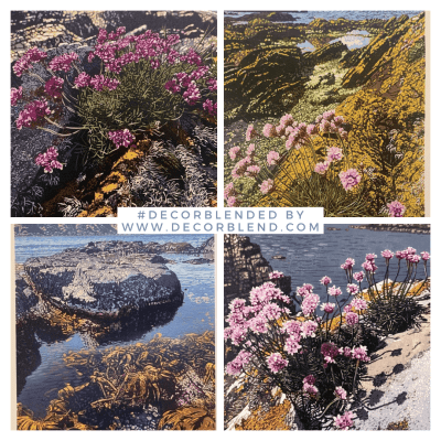 Explore the stunning beauty of seascapes and rock pools in the reduction linocut art by Joshua Miles. This intricate artwork captures the essence of coastal florals and marine landscapes.